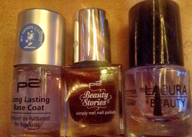 A dear (and crazy for doing this) friend of mine has gifted me the above set of nail polish!! This is a brand I was not familiar with and honestly, I really like it! I meant to post this sooner, but as I was busy working towards my degree, I didn't have time. And I actually wanted to make better quality pictures, but I still don't have a better camera than my iphone... Patience is a virtue, 2014 will be a year of pretty pictures! Yes I promise! But anyway back on track now. The set includes a basecoat from P2, a topcoat from Lacura Beauty and 3 beautiful colours (as you can see): 020 Chestnut, 190 midnight vamp and 080 lovely, all from the brand P2. We had been talking about using good basecoats and topcoats so the polish would last longer, because as I've posted before, nailpolish does not seem to stay put very long on my nails.